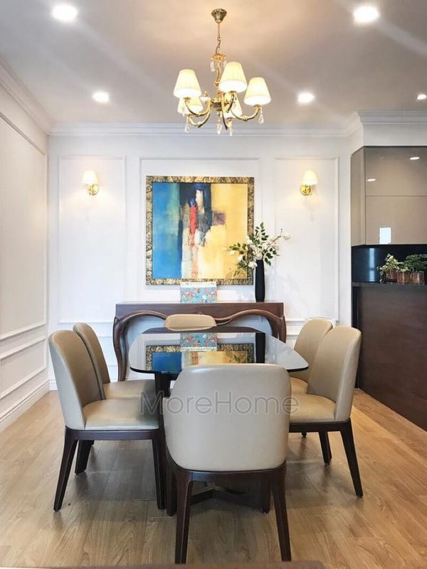 Thi công nội thất chung cư với bộ bàn ăn 6 người gỗ sồi kết hợp bọc da cao cấp theo bản thiết kế giúp không gian ăn uống trở nên ấm áp, thân thiện và hoàn hảo hơn.